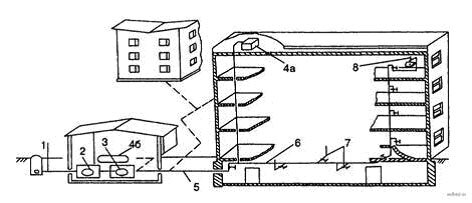 Система холодного водоснабжения здания: 1 - ввод; 2 - водомерный узел; 3 - установка для повышения давления; 4 - запасные и регулирующие емкости (4а - водонапорный бак; 4б - расширительный бак); 5 - квартальная сеть; 6 - внутренняя сеть; 7 - трубопроводная арматура; 8 - водоразборная арматура |