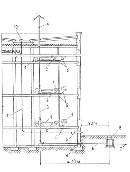 Схема канализации жилого дома (c сайта www.zdanija.ru) 1 - приемники сточных вод; 2 - отводные трубы; 3 - канализационный стояк; 4 - вытяжная вентиляционная труба; 5 - гидравлический затвор; в - выпуск; 7 - дворовая сеть; 8 - смотровой канализационный колодец; 9 - зазор в кладке фундамента на величину осадки здания; 10 - водосточная воронка; 11 - стояк внутреннего водостока. |